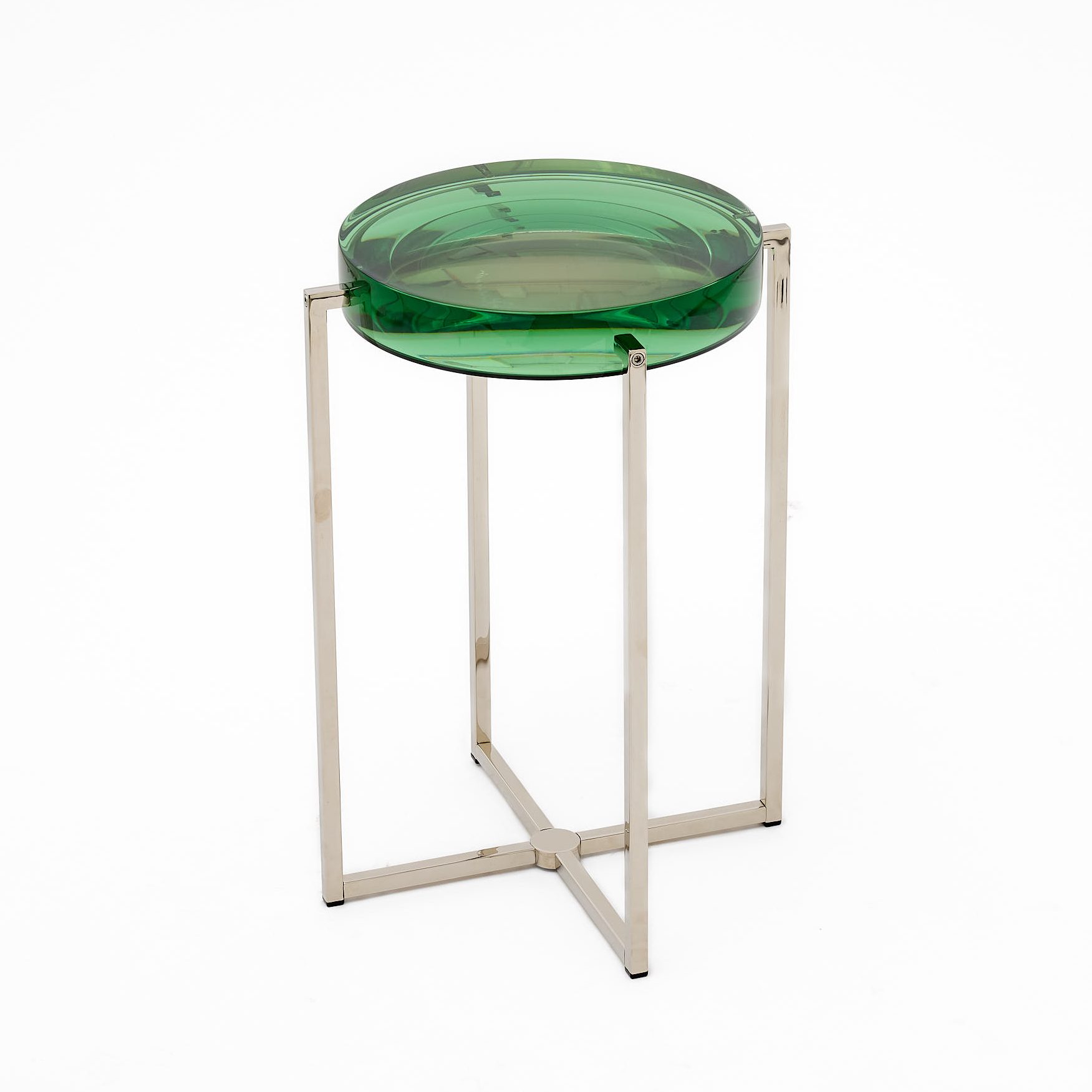 McCollin Bryan Lens table, studio stock, McB 60103:T, 35 x 59cm H, Prototype Bottle Green no. 3