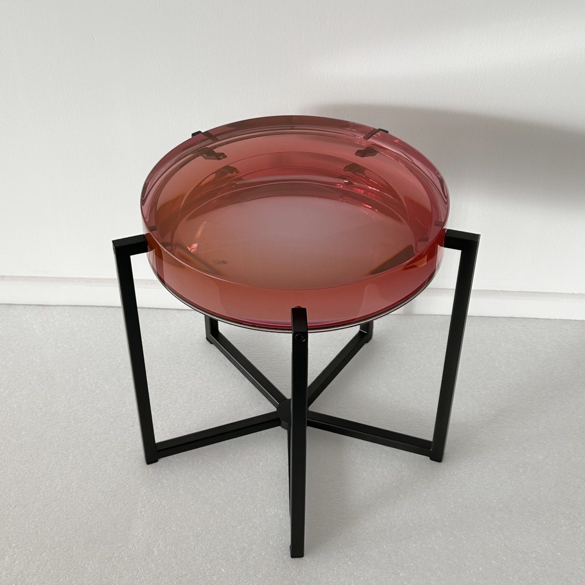 The Lens is a highly polished resin top in colour ‘Clear’, backed with a tinted mirror and with powder-coated black bronze, brass or nickel-plated base. The design is made to order.